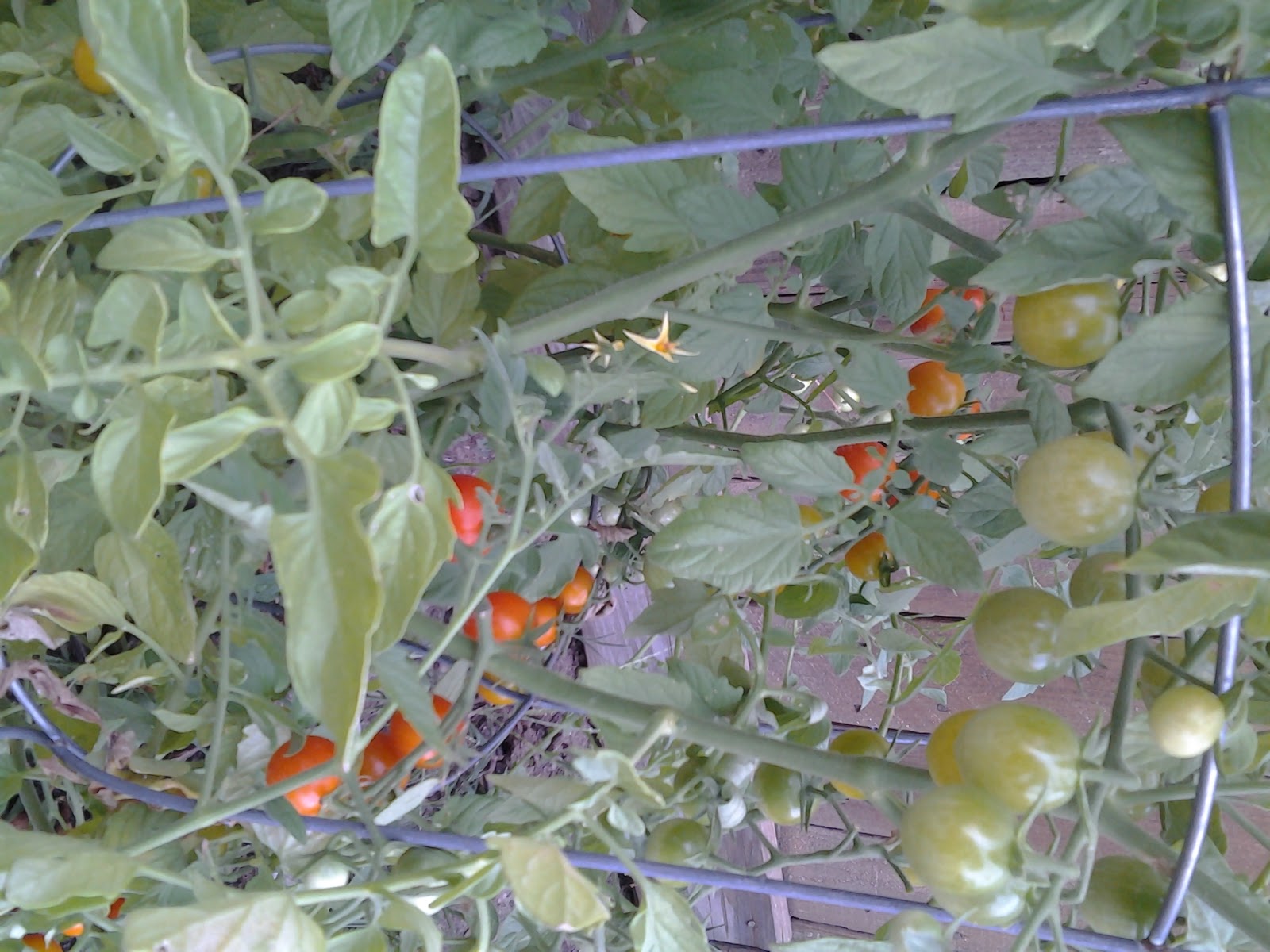 Cherry tomato plant, 1 of 3 which I hope keep producing delicious fruit. I am finding little green tomatoes all over the ground so am worried little critters are getting to them.